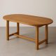 Meja makan berdesain minimalis dengan permukaan oval berwarna cokelat kayu natural. Bagian kaki terdiri dari dua rangka berbentuk “U” yang terhubung oleh balok horizontal di bawahnya, memberikan stabilitas dan sentuhan estetik yang sederhana namun elegan.